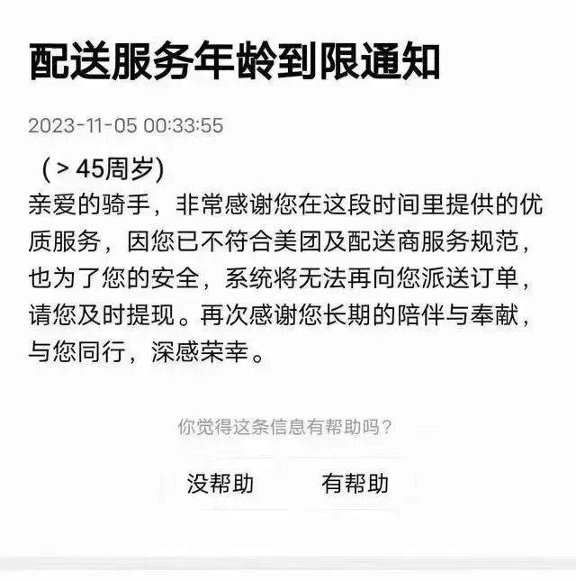 骑手到了45岁被强制下线本身已经是非常残酷的做法,更讽刺的是,美团骑手App还要问刚刚失去工作的骑手这条辞退信息有没有帮助……