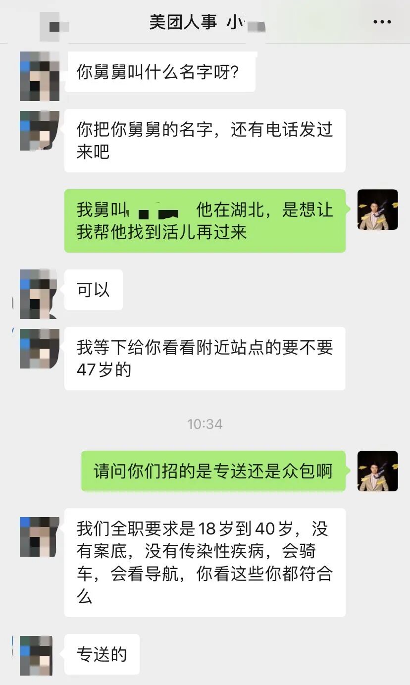 电话中,我表示是在帮我47岁的舅舅咨询美团骑手招聘,她的第一反应是“年龄有点偏大了”,但是随后表示可以加微信详细沟通。