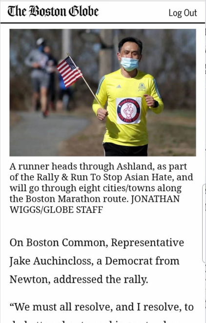 3/27日,CAAL 联合新英格兰华人联盟(NECAA)及几十家华人社团主办了沿波马的Rally and Run stop Asian hate活动. CAAL 主要负责波马跑程第二站Framingham