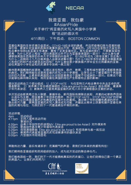 这个活动由新英格兰华人联盟、莱镇华协、新月国际联合发起,并有60多家各界团体参与,以音乐为主题,用亚裔青少年团体的歌声,传达"STOP HATE,STOP RACISM"的呼喊,唤起大众对美国亚裔历史和真实的亚裔文化的重视。通过青少年的觉醒和真诚的呼吁,联合各方力量,使美国亚裔历史写入课本成为可能,并籍此从根本上改善和提升亚裔在美国的处境与地位,为我们的下一代营造更加平等的环境。