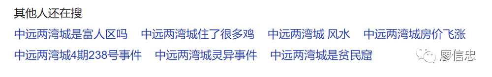 中远两湾城的搜索关联词搜索看起来“底蕴深厚,内涵丰富”,富人区与贫民窟同框出现,风水与灵异紧随其后。