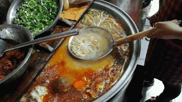 熬倒油水分离,吃的时候,一勺牛油、一勺老汤,再根据食客的要求加入牛的各种部位,最后再来一颗卤汤里浸透的卤蛋,一点香菜花生,就是一份地道的常德早餐。