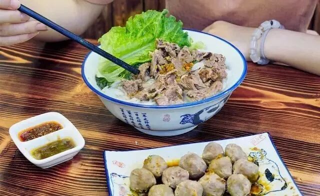 主要的配菜一般有三种,现切的吊龙肉,用开水烫到半熟,鲜嫩滑口;炖倒酥烂的牛腩肉,绵软入味;店家自治的牛肉丸,Q弹爽口。如果是熟客,又有特殊要求,店家也能提供胸口油、脖仁等特殊部位的牛肉。
