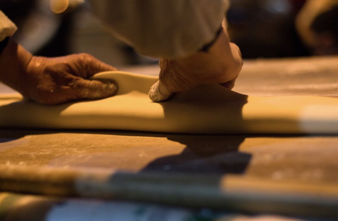南方米多面少,所以默认会用粿条来配牛肉。但其实,潮汕酥面才是牛肉面的最佳拍档。所谓酥面,近似于广州的竹升面,将面团用人力压到极其紧实,再切成发丝般细长。“酥”在潮汕方言里有筋道的意思,可见其口感。