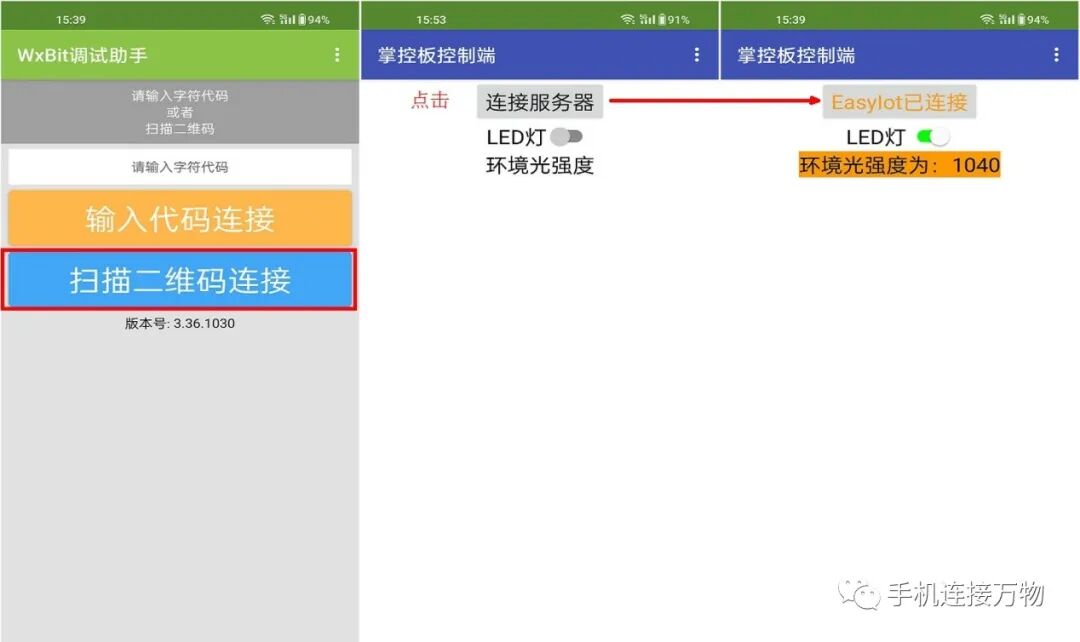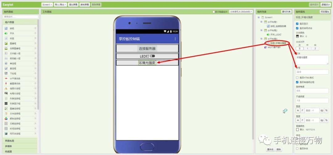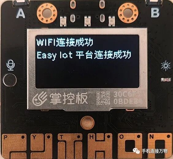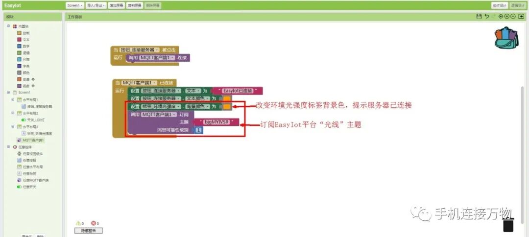 现在进行实际测试,把你的掌控板通上电,检查确认掌控板上有没有提示“wifi连接成功”和“Easy Iot平台连接成功”?点击手机上的连接服务器,会不会提示连接成功?通过手机上的“LED灯开关”能不能控制掌控板LED灯?“环境光强度”标签有没有定时更新数据?