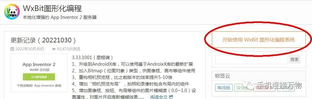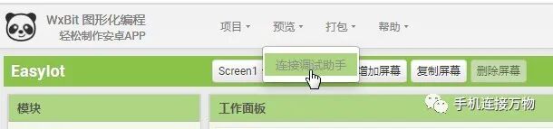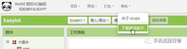 AI2支持手机预览并运行程序。在WxBit平台,预览功能需要在Android手机安装一个叫做“WxBit调试助手”的App。在“帮助”菜单下点击“下载调试助手”,用手机扫描二维码进行安装即可: