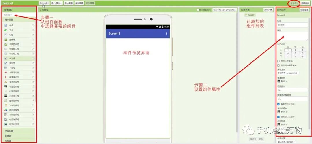 “组件设计”窗口用于设计程序的界面,AI2 提供了广泛的组件和功能,包括按钮、文本框、图片、声音、视频、传感器等等,用于构建应用程序的用户界面和实现交互功能。使用方法很简单,就拖放组件和设置属性两个步骤。首先在“组件面板”选中所需的组件后,使用鼠标拖拽到中间的手机界面区域,就能在项目中使用该组件了,点击组件右边的问号,可以查看组件的介绍。然后在“组件属性”区域,可以对选中的组件属性进行设置,每个组件都有一些相应的属性,用于定义其外观和行为。