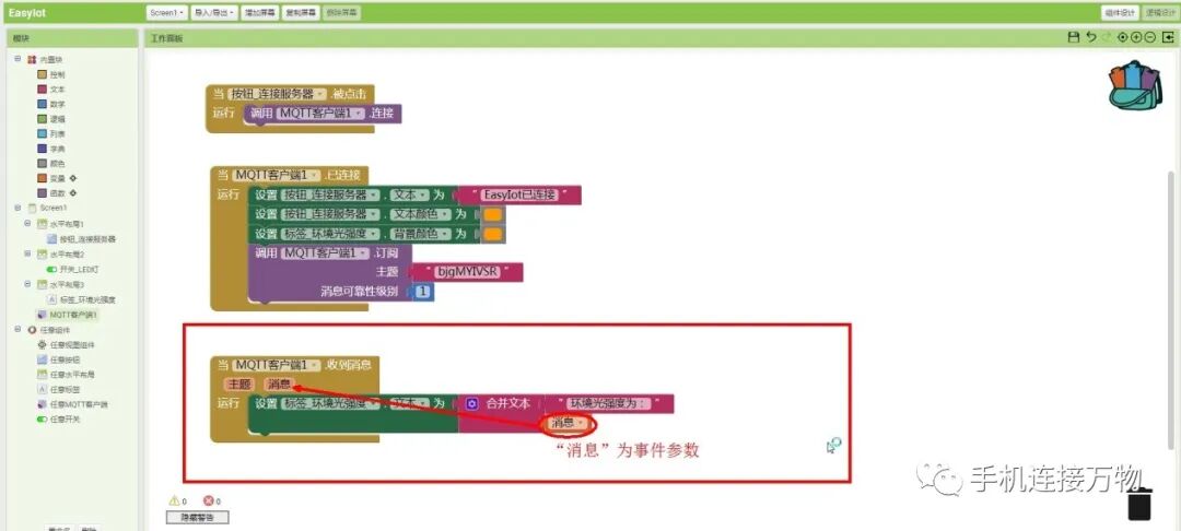 接收环境光强度数据:订阅主题后,每当收到EasyIot平台发来的数据,我们就通过“环境光强度”标签来显示数据。从“MQTT客户端”模块拖放“当…收到消息”积木到工作面板。该积木有“主题”和“消息”两个参数,把“消息”参数设置为“环境光强度”标签的文本,此处用了“合并文本”积木,让数据显示更直观。参考程序如下: