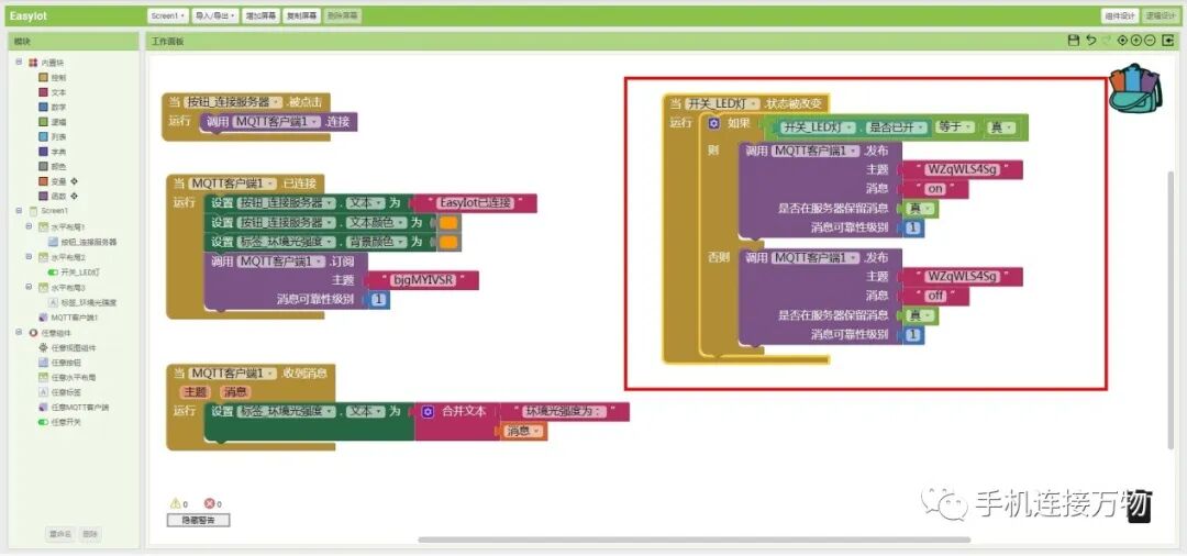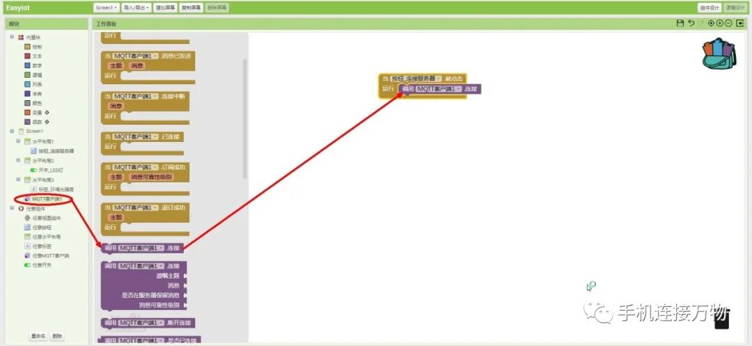 按钮单击事件:该事件用于点击按钮后连接EasyIot服务器。由于MQTT服务器连接参数已经在组件属性中设置完毕,所以此处只需要调用连接操作即可。点击“按钮-连接服务器”模块,拖放“当…被点击”积木到工作面板,再点击“MQTT客户端”模块,拖放“调用…连接”积木到前一个积木内即可。