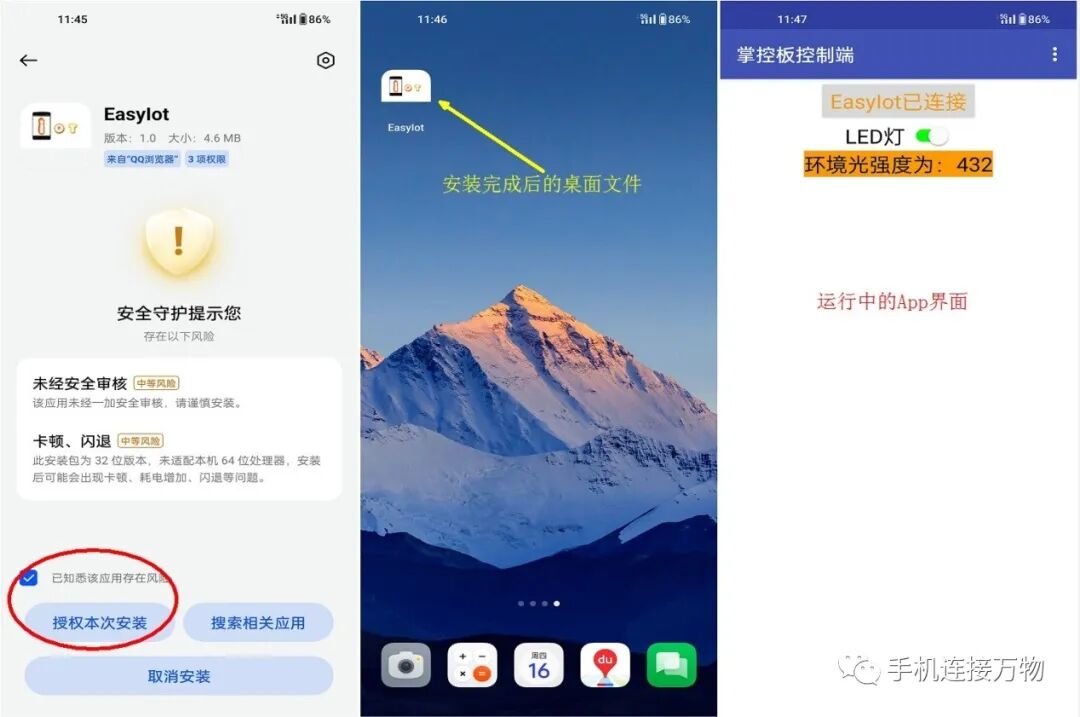 由于App不是由手机的应用市场下载的,所以会有风险甚至是病毒提示,选择授权安装即可。安装成功后,手机桌面会生成App的图标,点击运行试试看。到此,你已经初步掌握了物联网平台、设备端和应用端的联网定制化开发,赶快动手试试,把你的物联网创意变成现实。