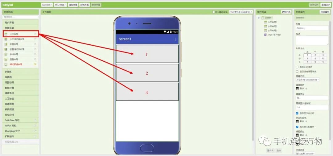 从左侧“组件面板”栏下面的“界面布局”中拖放添加3个“水平布局”组件到手机预览界面。界面布局组件主要用于容纳并调整其他可视组件在屏幕上的位置。