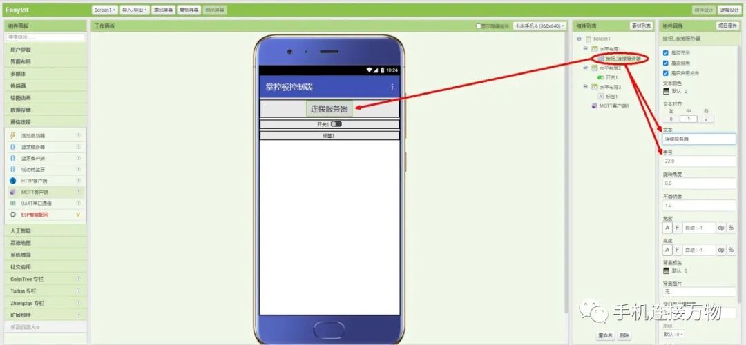 选中“按钮”,把“文本”设为“连接服务器”,“字号”设为“22”:
