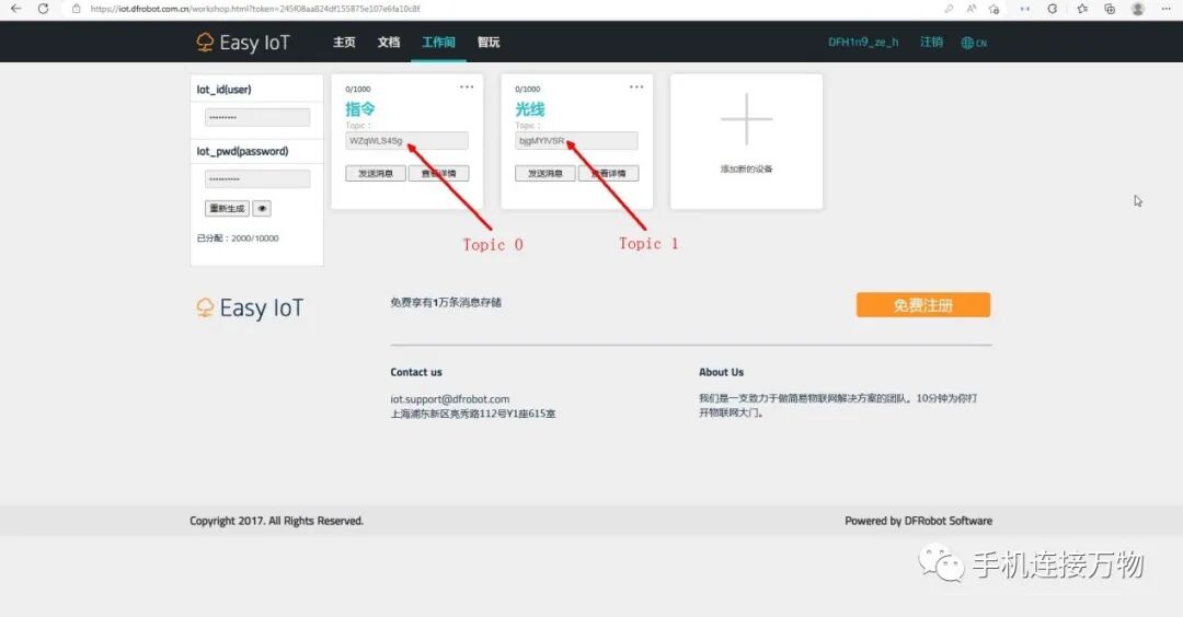 (1)在Easy Iot平台添加2个设备(主题),分别命名为“指令”和“光线”