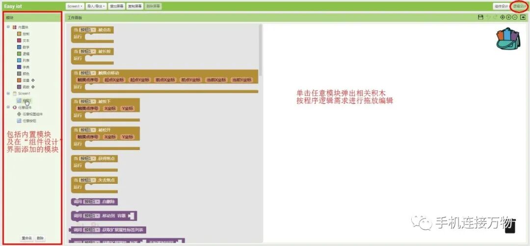 切换到“逻辑设计”窗口,在“模块”栏中列出了平台的内置块和“组件设计”窗口中添加的组件块,选中某个块,相关的积木就会自动列出,通过按照一定的顺序拖放和连接积木块,就可以创建应用程序的逻辑和功能。是不是很熟悉?就是和Mind+一样的操作。