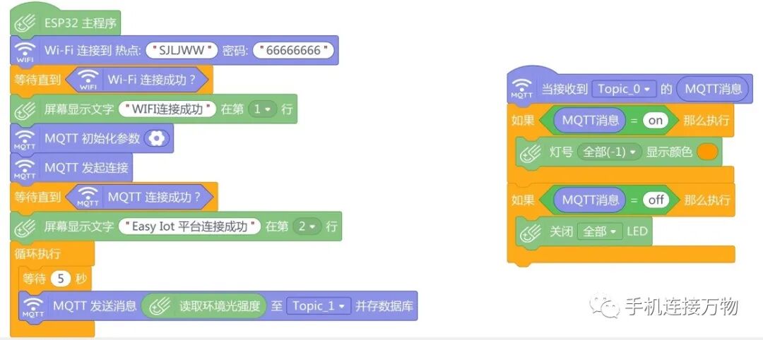 订阅环境光强度主题:前面我们已经设置了掌控板每隔5秒上传环境光强度到EasyIot平台的“光线”(topic1)主题,此处要接收环境光强度数据首先要订阅该主题。此处我们可以把订阅的操作添加在服务器连接成功这个事件中:
