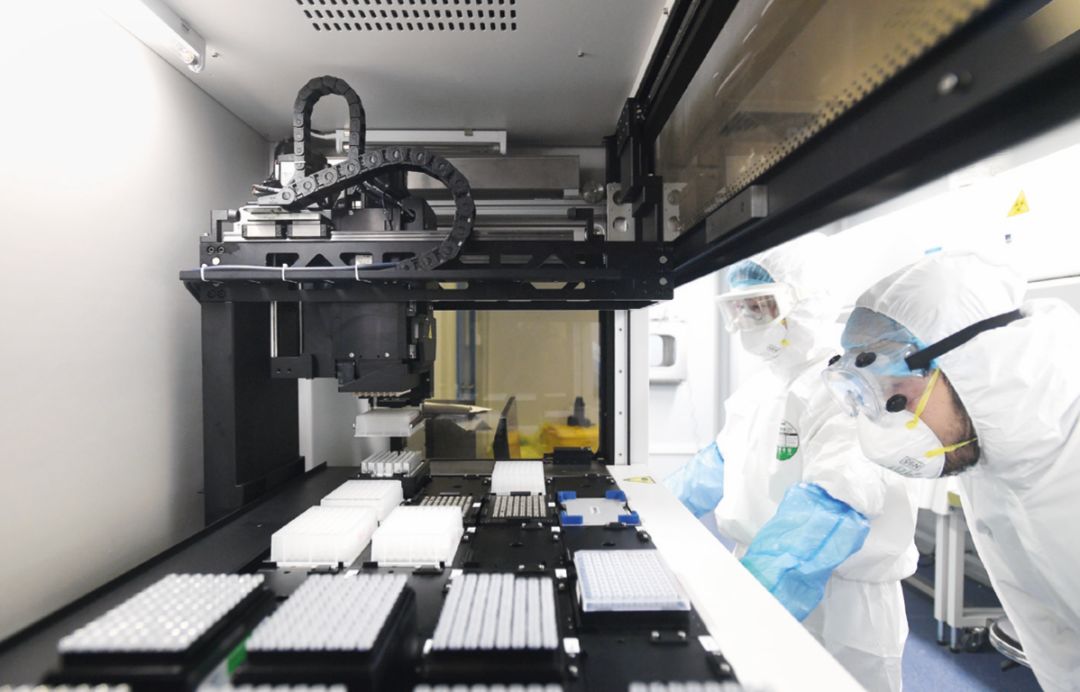 2月6日,武汉东湖高新区,在“火眼”实验室的自动化提取室内,华大智造的SP-960样本处理工作站正在进行自动化核酸提取。摄影/长江日报 周超