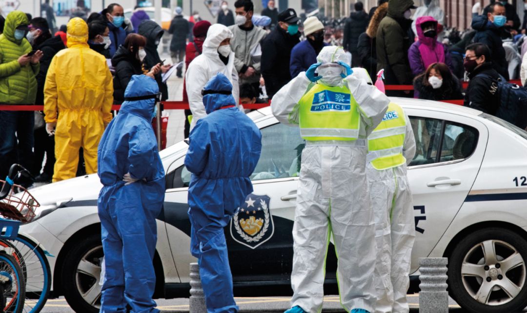 2月1日,武汉市汉口新华路上,在疑似新型冠状病毒感染者排队确诊的队伍旁,一名现场维持秩序的警察正在做防护准备。摄影/长江日报 金思柳