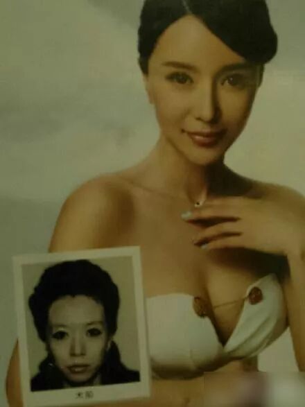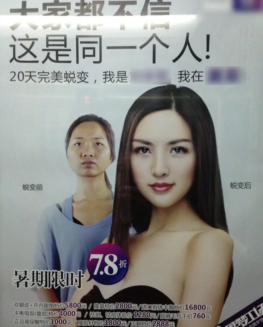 电梯广告里的before、after首要当然是拿脸来说话,把脸整好你能不来吗?恶俗低下的整形医院广告(应该是)最爱找那些很明显前后根本不是一个人的来拍这样的广告,比如说: