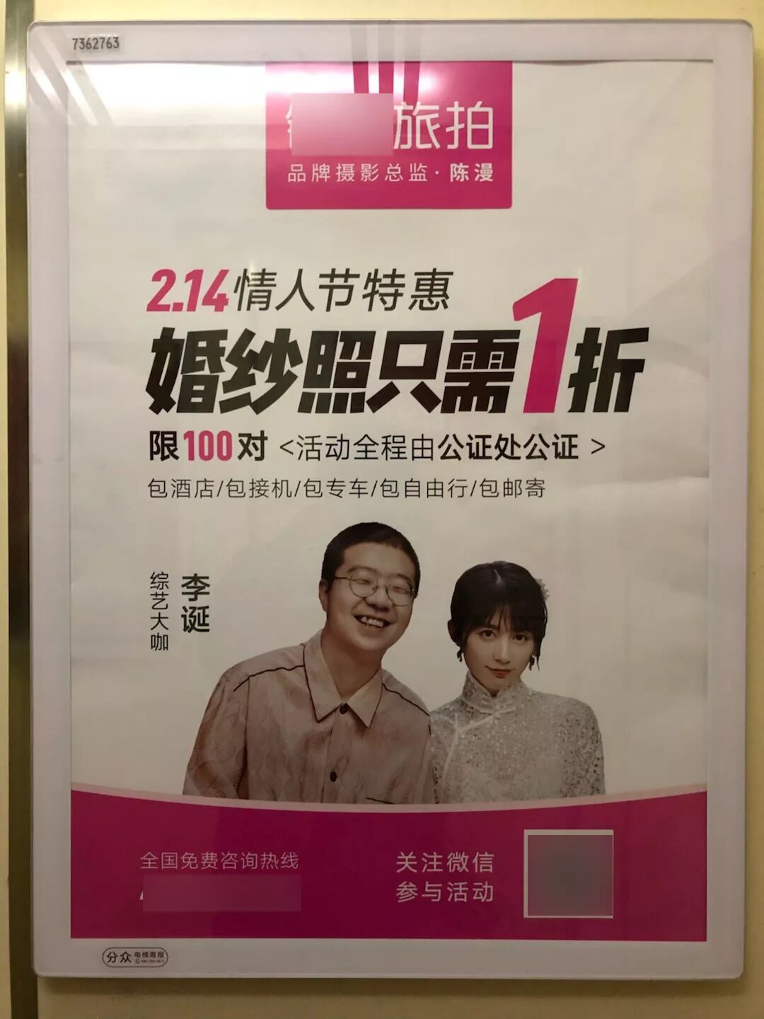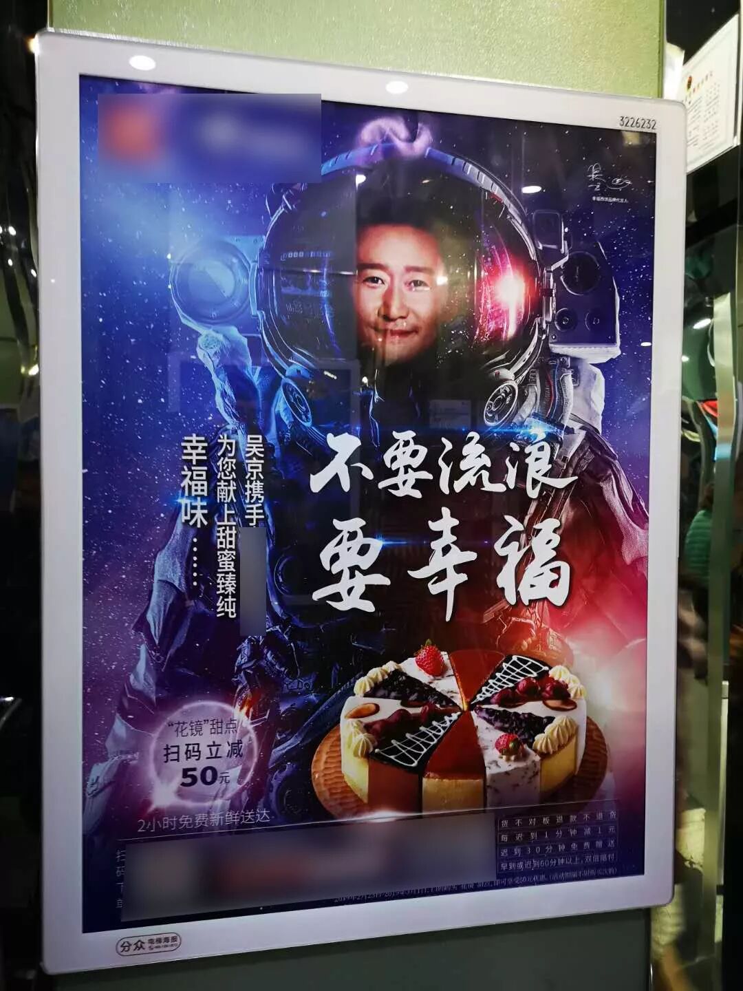 垃圾电梯广告界也紧跟潮流热点,比如这张紧跟春节大hit电影的广告,跟得让人不忍直视,这个广告海报的宇航服非常诡异,拿着生日蛋糕的宇航服里有张吴京的脸就更别提看着有多难受了: