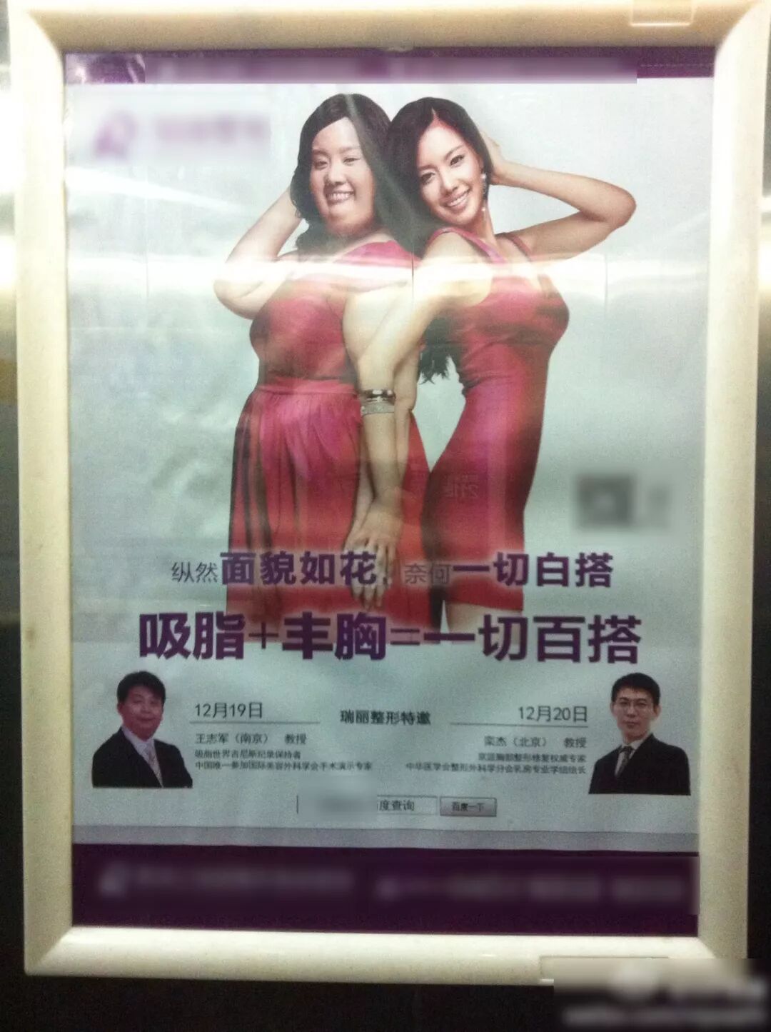 电梯里的整形广告恶俗低下不只在脸的before、after,直接减脂瘦身拿女性做文章的也不少......