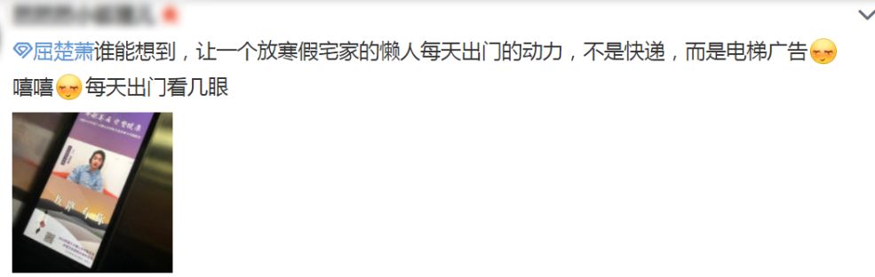 好吧,因为他们有钱可以在时间和空间里给你无限循环。但你知道,有时候大家都一致讨厌的并不是重复本身,好看的东西天天看是不会厌烦的,厌烦的是天天看着聒噪又难看的垃圾。比如这两天因为《流浪地球》火起来的小生屈楚萧,同样是电梯广告,有人愿意为了看他增加上下楼次数而不是走楼梯好吗。