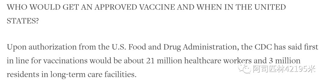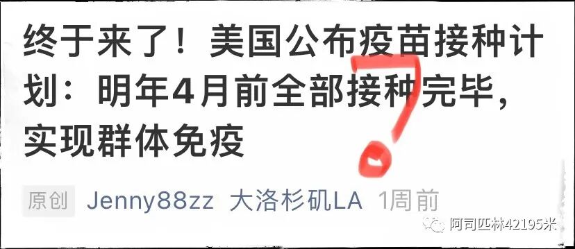 现在对大众何时能打上疫苗有各种传说,有些公众号误传美国会“明年四月前全部接种完毕”,作者可能不了解两针疫苗之间需隔3到4周才能打完。