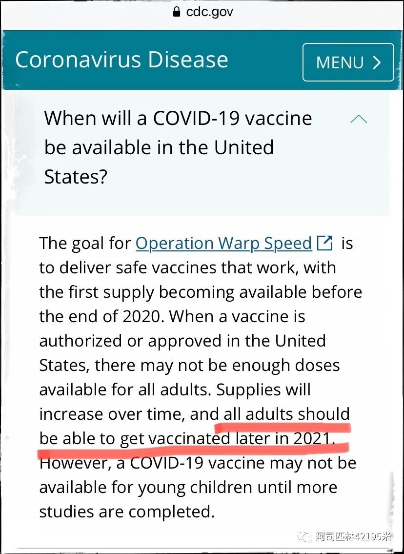 目前CDC明确指出:到2021年的下半年,所有的成年人应该可以得到疫苗。但儿童什么时候能打上疫苗还需要更多的临床试验。