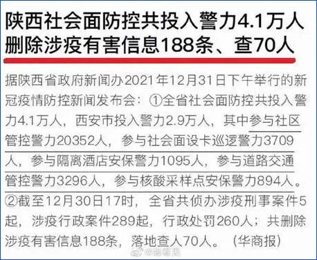 陕西此前的消息有称,删除涉疫有害信息188条,落地查人70人。