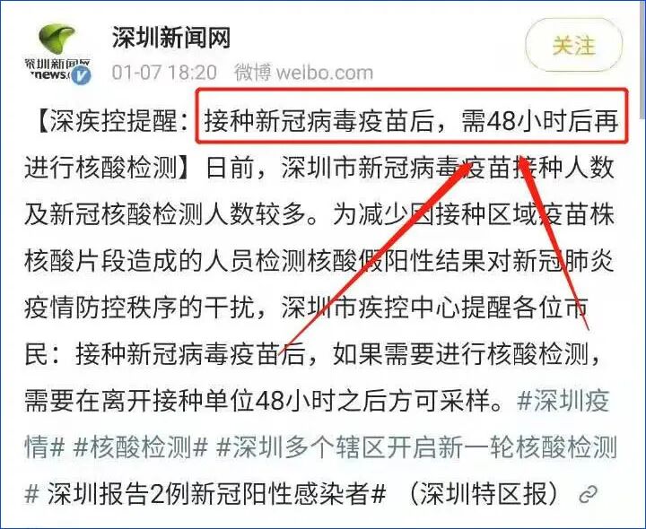 “打完疫苗不能直接做核酸,否则就是阳性”,这句话无论以什么标准来看,都不能算是谣言,顶多也就是表述不够严谨而已,因为,各地的疾控部门已经有多次提醒过,接种新冠疫苗后,需要在48小时(有些地方是24小时)之后再进行核酸检测。