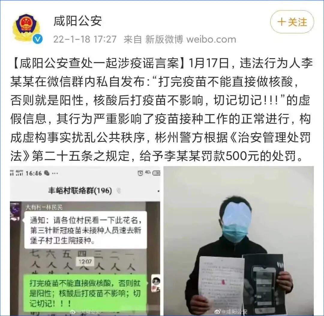 结果,大概是被人举报了,然后警方就定性为涉疫谣言案,并认定其行为严重影响了疫苗接种工作的正常进行,构成虚构事实扰乱公共秩序,处罚款500块!!!