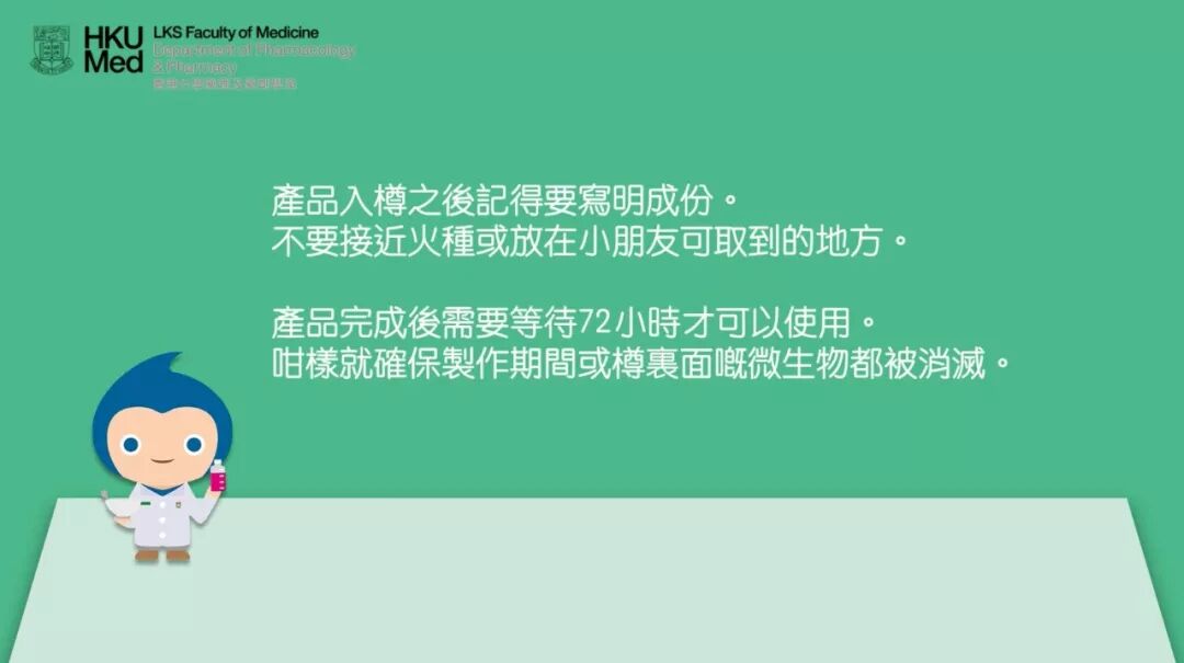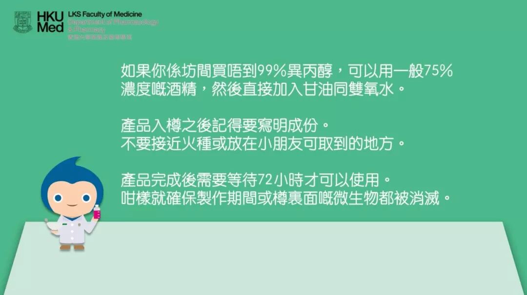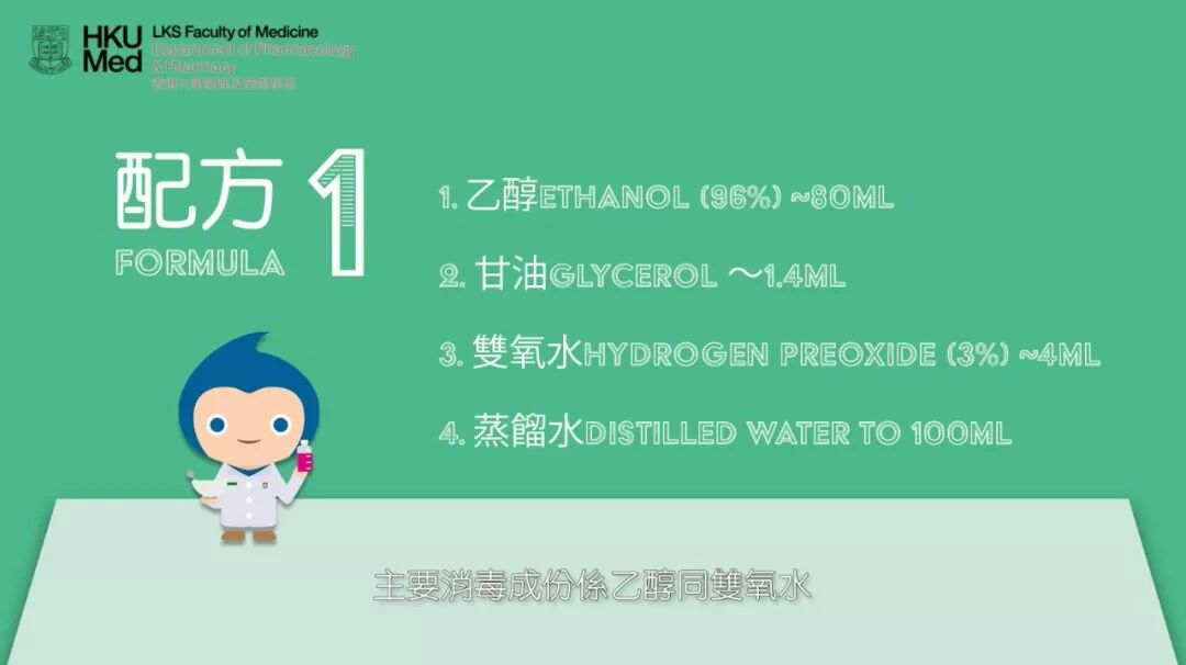 为支持市民在日常生活中更好地保护自己,香港大学药理及药剂学系前日在社交网站上分享了一段视频,教授大家根据世界卫生组织配方,使用简单器皿和可以在普通药房买到的材料自制酒精搓手液。