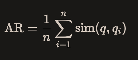 然后,我们利用文本嵌入模型来获得所有问题的嵌入。对于每个qi,我们计算与原始问题q的相似性sim(q,qi),相似性计算可以使用嵌入之间的余弦相似性,计算问题q的答案相关性得分AR,如下图公式所示: