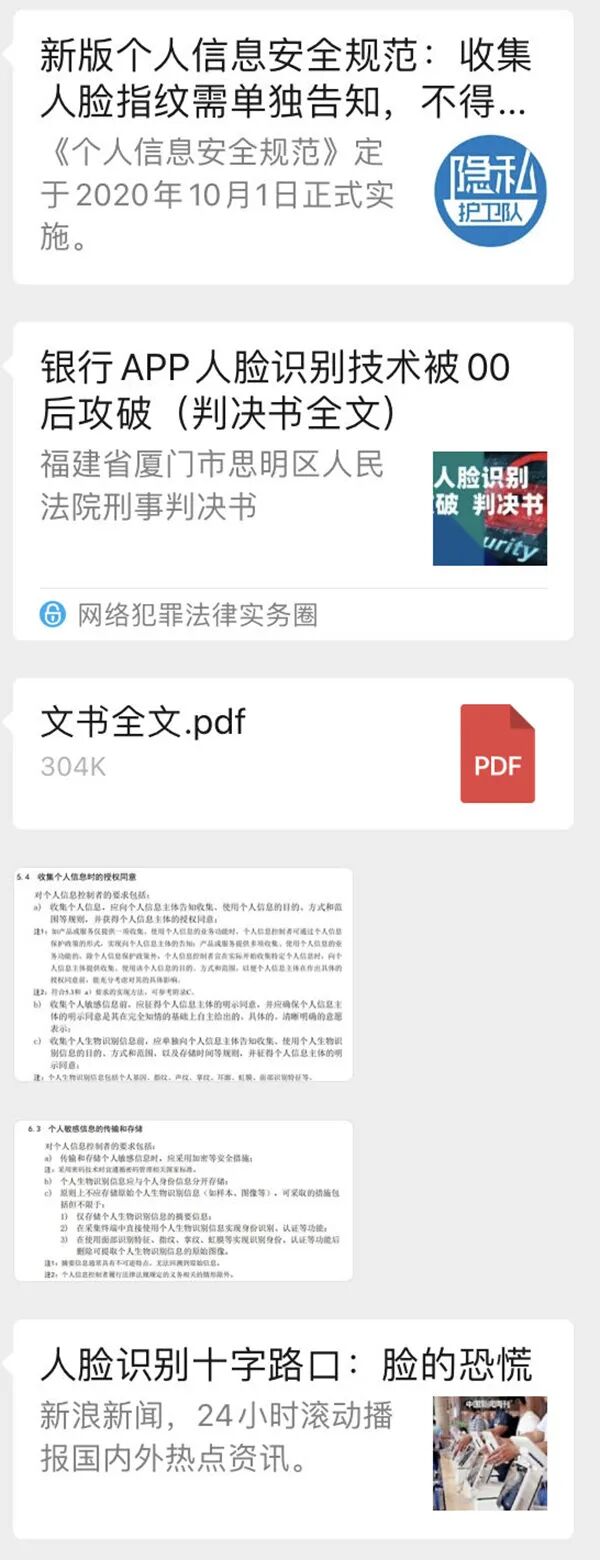我在小区两个业主群中发了人脸识别风险性相关的报道和法律依据,包括福建省厦门市银行APP人脸识别技术被“00后”攻破、及浙江省衢州市张某等人侵犯公民个人信息罪的刑事判决书、新版《信息安全技术 个人信息安全规范》等材料。《个人信息安全规范》规定,收集人脸信息需要单独告知并获得个人信息主体的授权同意,且不得存储原始图像。![]()