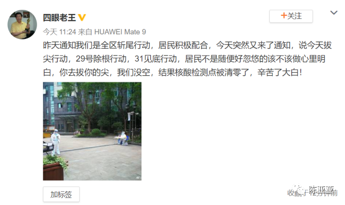 不过,测核酸跟出门挂钩,居民也就比较配合。我不是每次都做,无所谓黄码、也不想出门当小白鼠,但看到志愿者爬楼上门来采样,也只得做了好几次。因此,在微博上看到别人小区的集体拒绝,油然地心生羡慕。