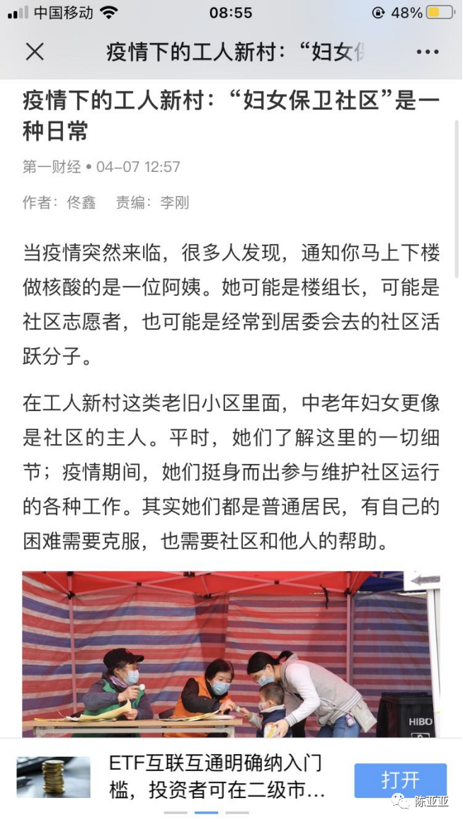 前两天情绪爆发的另一个导火索,是看到有人在朋友圈转了个文章,特别把“通知马上下楼做核酸”拎出来,作为在疫情中挺身而出、妇女保卫社区的榜样,让我产生了反感。