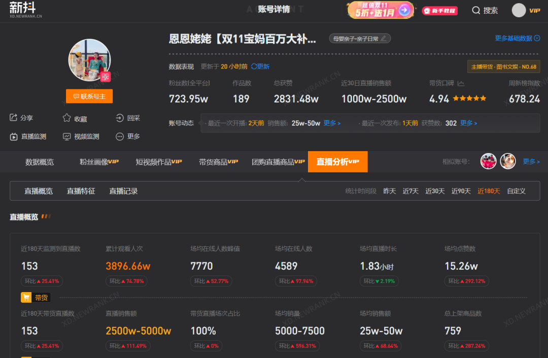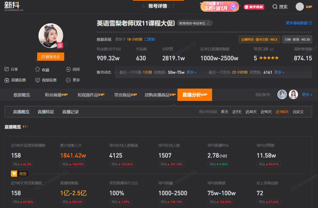 知识付费领域的头部博主“英语老师雪梨”粉丝超909万,新抖数据显示,该账号近半年直播158场,累计观看人次超1841万,直播预估销售额破亿。带货商品为雪梨老师的英语课程,包括零基础英语、新概念英语和绘本口语跟读等,售价从298元到998元不等。“恩恩姥姥”去年11月起更新英语童话系列,她和外孙女恩恩,常常一个扮演恶毒的后妈,一个扮演灰姑娘,二人将英语对话融入日常生活,一年吸粉超700万。新抖数据显示,“恩恩姥姥”近半年直播153场,累计观看人次超3896万,预估销售额超2500万。为什么在日渐内卷的内容领域,每年有英语老师成为涨粉榜的“黑马”呢?英语学科曾是K12教育培训行业的领头羊,随着“双减”靴子落地,大量英语老师投入自媒体的怀抱中,他们凭借丰富的英语经验获得了线上流量,通过知识付费课程完成了财富的二次积累。与此同时,一些孵化名师博主的MCN机构也应运而生,比如除了上文提到的密疯文化,还有主攻泛教育领域的“101名师工厂”,曾在2020年获得数千万投资,其创始人覃流星在个人抖音账号“网红校长”上,多次讲解自己孵化的名师IP案例,以此号召教培老师们开启事业第二春。在圆圆看来,“英语比起其他小语种的受众更广,比起语文数学等学科更生动和有趣,既能和日常生活结合,也可以和音乐影视等娱乐属性更高的内容结合,因此英语老师里可以说是网红最多的”。无论是英语配音、结合生活讲单词,还是曾经火上热搜的用甄嬛传学英文,英语作为一门语言学科和表达工具,和生活的关联性大,本身就有很强的内容属性。一位入行三年、目前仍在教培机构的英语老师Alice认为,做自媒体更适合资历深的老师们,“如果没有足够的实力就去做网红老师,恐怕会捡了芝麻,丢了西瓜”。Alice透露,虽然她同样会把平时上课的片段发到社交平台,但备课、教学和课后辅导等工作已经占满时间,没有足够精力专心运营自媒体。圆圆认为,如果要做线上,必须All in才有机会,现在无论是语言还是教育赛道,都越来越卷,爆红是可遇不可求的。“不得不承认,很多网红老师,天生就是吃这碗饭的。”• 作为数据驱动的互联网内容科技公司,新榜提供新媒体内容营销和企业服务系列产品,助力中国企业数字化内容资产获取与管理,服务于内容产业,以内容服务产业。• 我们的客户既包括中国平安、腾讯、字节跳动、京东、宝洁、雅诗兰黛、欧莱雅、联合利华、迪士尼等500强,也包括正在蓬勃成长的中小企业、新兴品牌和MCN机构。面向企业的内容化组织建设,新榜提供从公域流量募集分发到私域内容运营建设的各项所需。