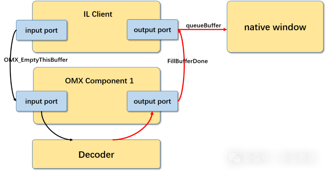上图展示了一个普通的数据处理流程,Decoder会先将处理好的数据填充到output buffer中,随后OMX组件会调用FillBufferDone函数将填充好的buffer传递给IL Client,IL Client在做好音画同步后,会将这个output buffer送入native window进行渲染。