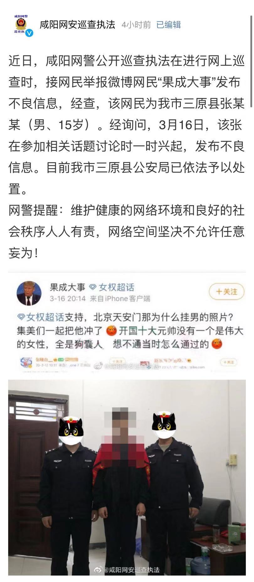 据@咸阳网安巡查执法 今日(4月4日)微博消息: