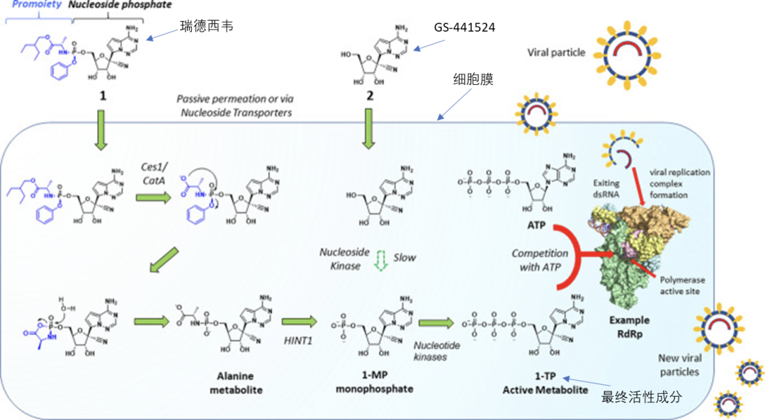 瑞德西韦最终活性成分(1-TP)的代谢过程(来源,引文6)