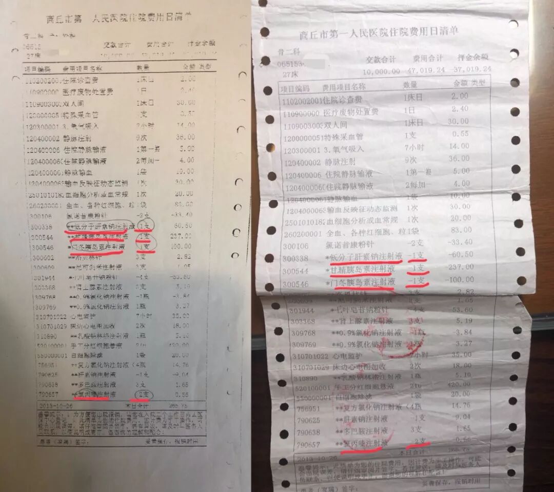 此外,家属从医院开出了多份费用日清单,这些日清单之间也存在信息不一致的情况。在上述打印于2018年的一份住院费用日清单上,显示2013年10月26日,李文贵使用低分子肝素钠1支,氯丙嗪2支,甘精胰岛素1支,门冬胰岛素1支,而在另外一份费用日清单中,几种药剂前被标注了一个“—”符号,并且扣除了相应费用。