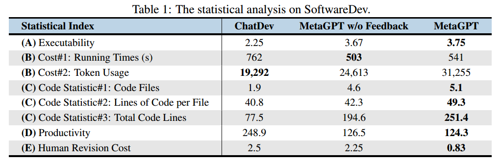 实验2是自行构建了一个SoftwareDev的数据集,其中有70个代表性的软件开发任务,Baselines采用ChatDev,MetaGPT在SoftwareDev上大部分指标均优于ChatDev,虽然需要消耗更多Token,但是代码生成效率Productivity(一行代码消耗token)上,还是要优于ChatDev。