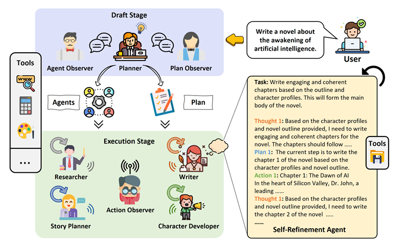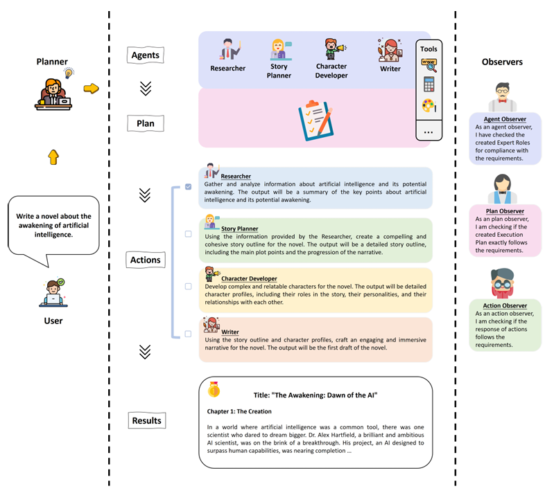 为了完成这个任务,Planner 设计需要的几位专家:一名研究人员(Researcher)收集有关人工智能及其潜在觉醒的信息,一名故事策划者(Story Planner)概述小说,以及一名角色开发人员创造引人入胜的角色,最后,需要一名作家负责撰写叙事。 这些角色均由是一个 Agent智能体。在执行阶段每个角色Agent自行完成自己的任务。