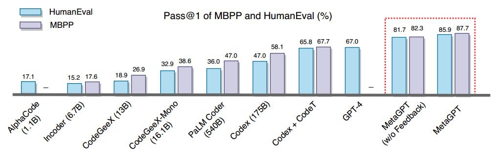 在实验部分,实验1:使用MBPP、HumanEval两个代码生成数据集,Baselines采用在代码生成领域的LLM,MetaGPT在HumanEval和MBPP基准测试中都优于其他方法