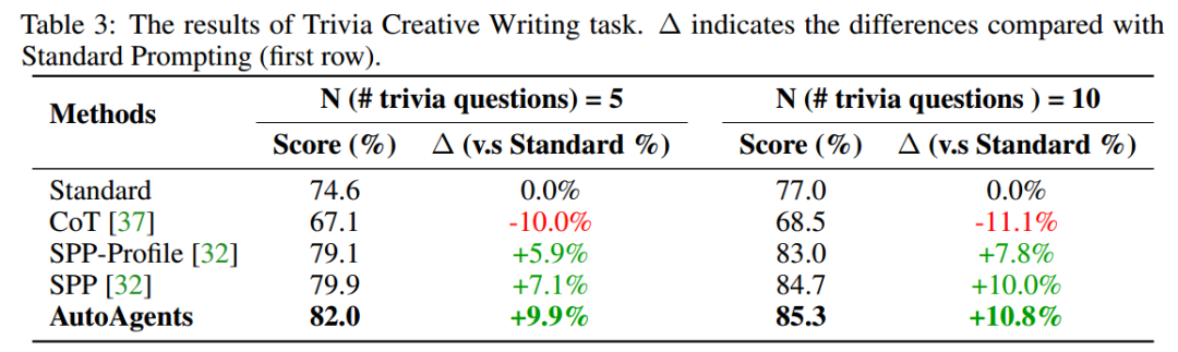 第二个是在创意写作任务上,这项任务要求模型围绕一个给定的主题编写一个连贯的故事,同时结合 N 个问题的答案。创意写作任务度量分数Score=#正确答案提及次数/#个数问题AutoAgents在知识获取方面优于现有方法的性能。与不使用Agent生成的标准方法相比,AutoAgents在所有实验中都实现了10%的显著改进。