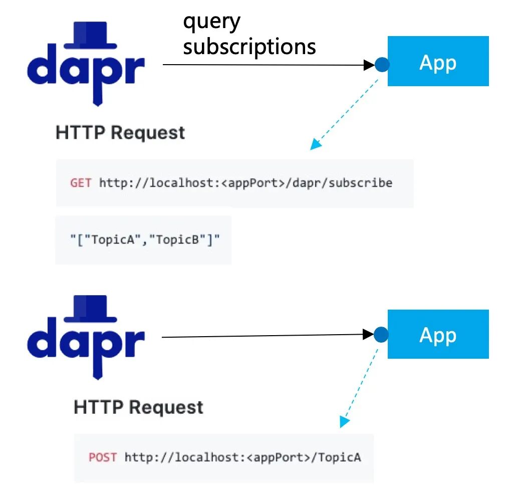 dapr 首先会请求应用,咨询应用需要订阅那些主题(topic),如例子中应用返回的的 TopicA / TopicB