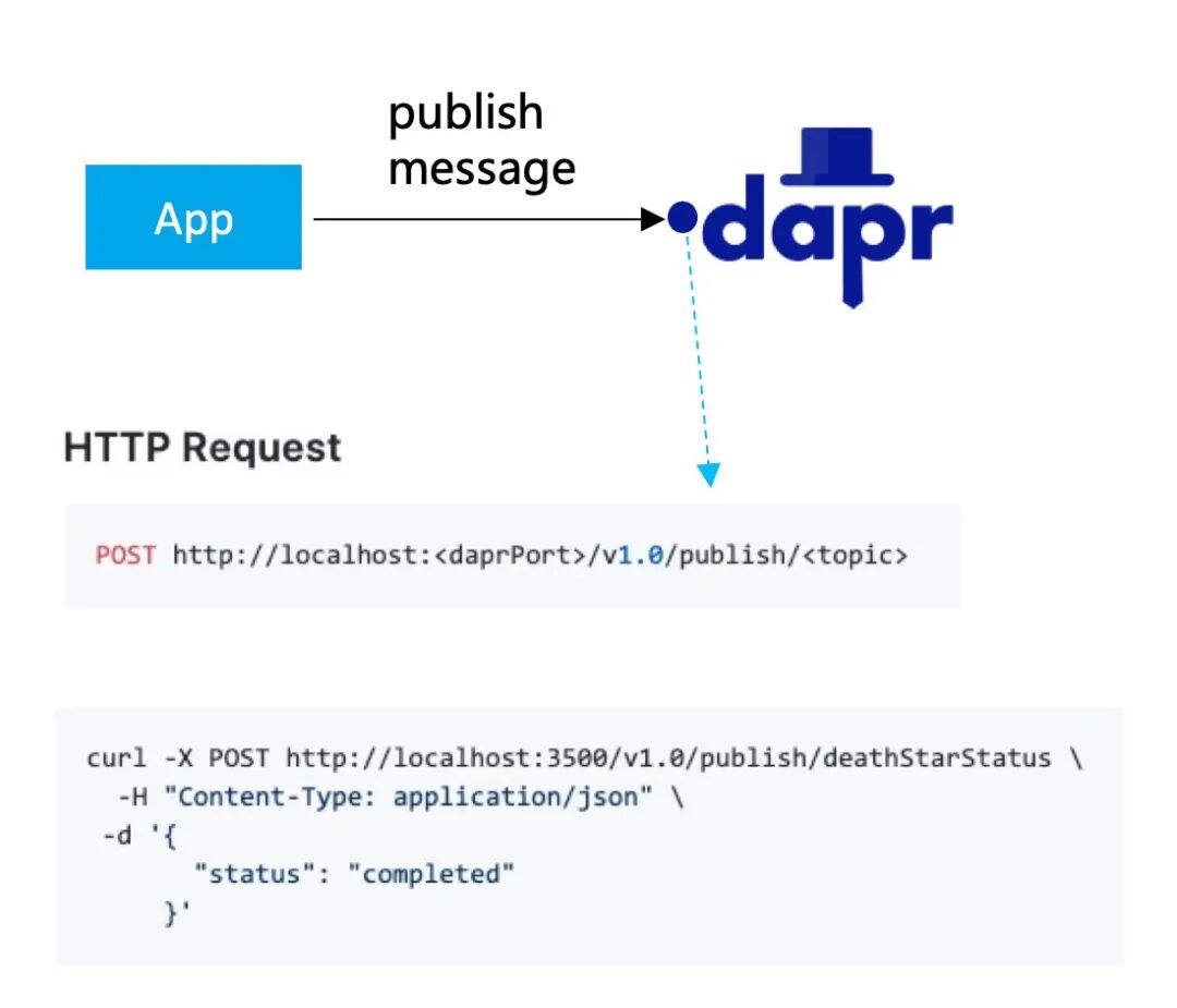 我们看一个更明显的例子,dapr 提供的 “publish/subscriptions” 能力,让应用可以方便的发布消息,或者订阅主题并接收消息。下图是应用发布消息,请求直接发给 dapr 即可:
