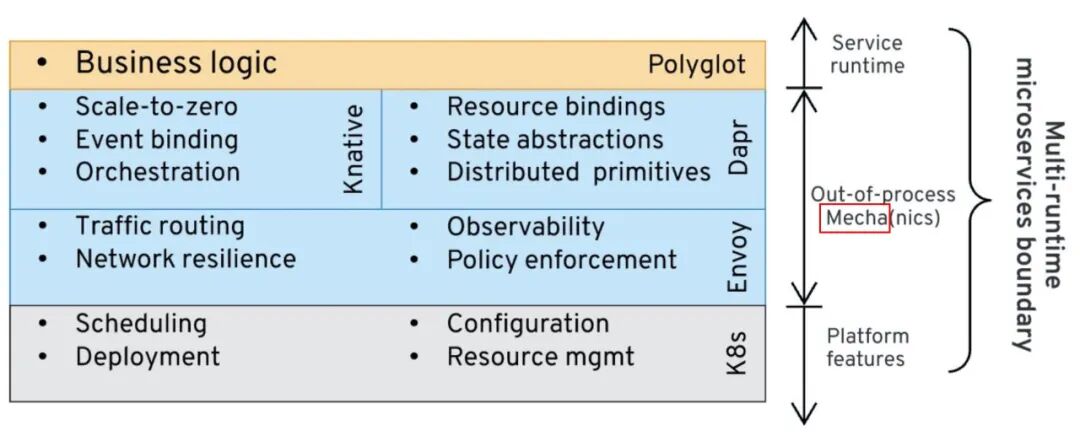 Multi-Runtime Microservices Architecture,作者 Bilgin Ibryam,Mecha 的思想来自这篇文章,强烈推荐阅读。也可以直接看我翻译的版本 多运行时微服务架构。如前所述,建议在阅读本文之前先阅读这篇博客文章。