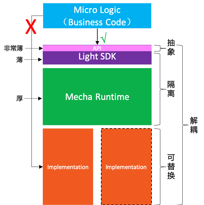 轻量级 SDK 和 Mecah Runtime 配合,完成对底层实现的解耦和可替换。