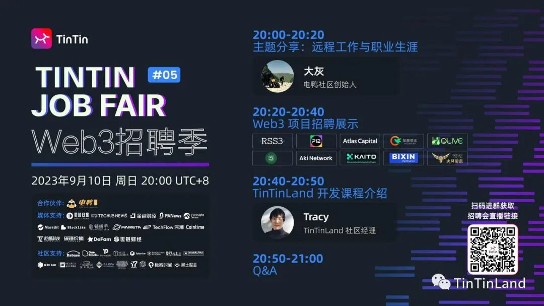 Web3 行业风云变幻之际,TinTinLand 开发者社区准备了第 5 期 TinTin Job Fair 线上招聘会,邀请到电鸭社区创始人——大灰作为特别嘉宾,畅谈 Web3 行业所需的核心技能和人才需求,为广大 Web2、Web3 开发者和从业人员提供就业建议,也帮助从 TinTinLand 开发者社区走出来的学员们找到属于自己的工作定位。同时,TinTin Job Fair 也欢迎大家积极留言自己感兴趣的专场或岗位,我们会陆续推出更多的专场招聘会,尽可能满足大家的职业发展需求。话不多说,让我们一同锁定本周日晚 20:00 的 TinTin Job Fair,查收本期活动详情!