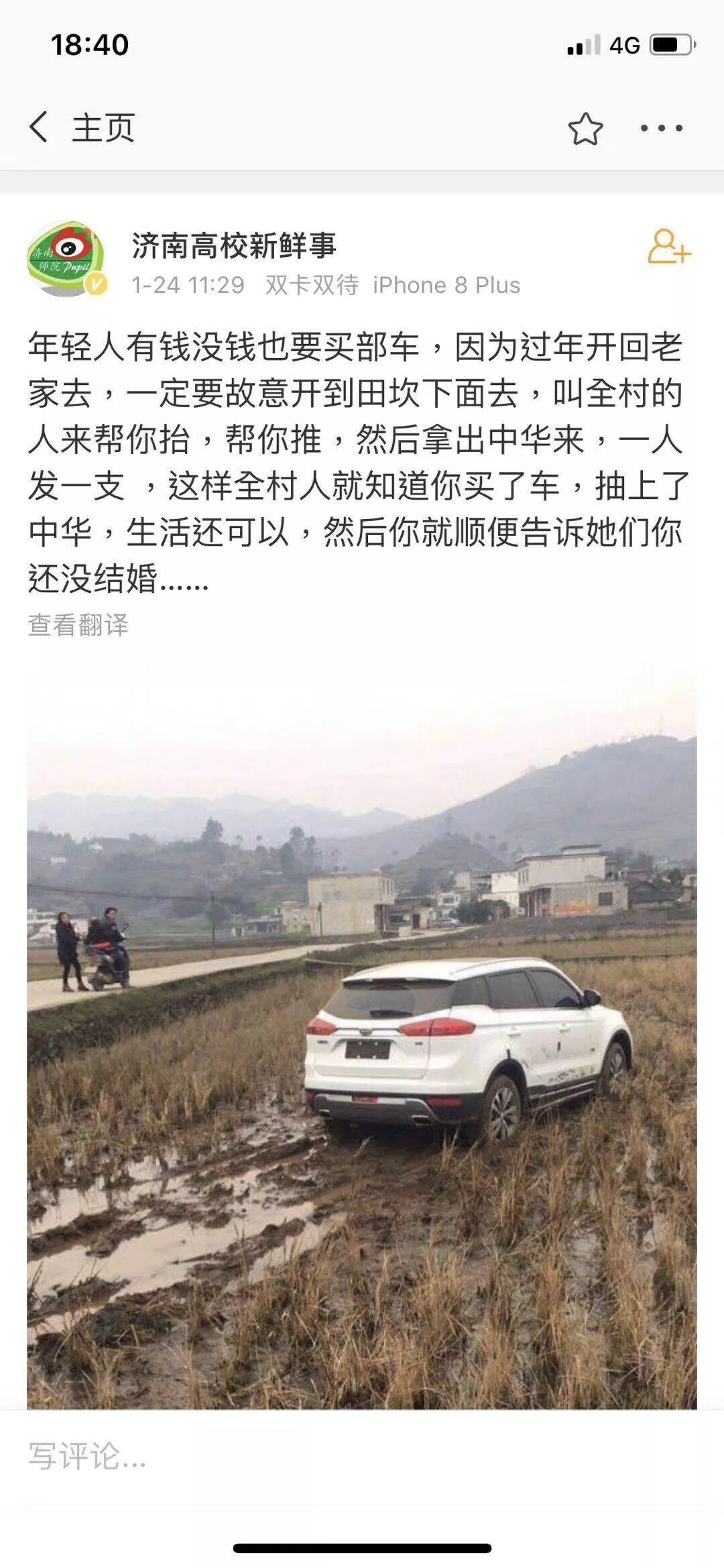 另外春节期间用车记得不要经常擦拭的锃亮,显得跟一整个节日期间都没用过似的,最好的状态是车身上布满适量的污渍,这样别人一看就知道你在春节期间有在努力各处奔跑进行社交,而不是宅在家里非常不合群,合群是一个山东男孩非常重要的特征,也就是小时候的“懂事”,一个懂事的山东男孩可以不认识所有亲戚,但必须在春节期间见过所有亲戚。